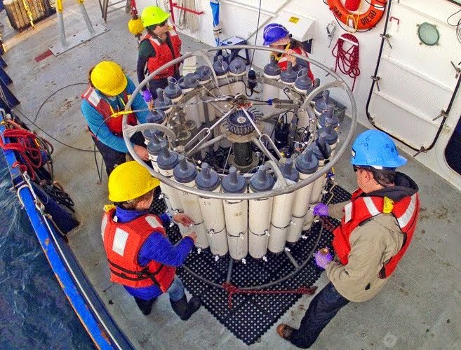 CalCOFI has collected hydrographic & fisheries data off California since 1949. From 1949-1992, CalCOFI deployed an array of hydrographic bottles to collect seawater. In 1993, CalCOFI adopted a Seabird 911+ CTD; 1m data are available from 1993-present